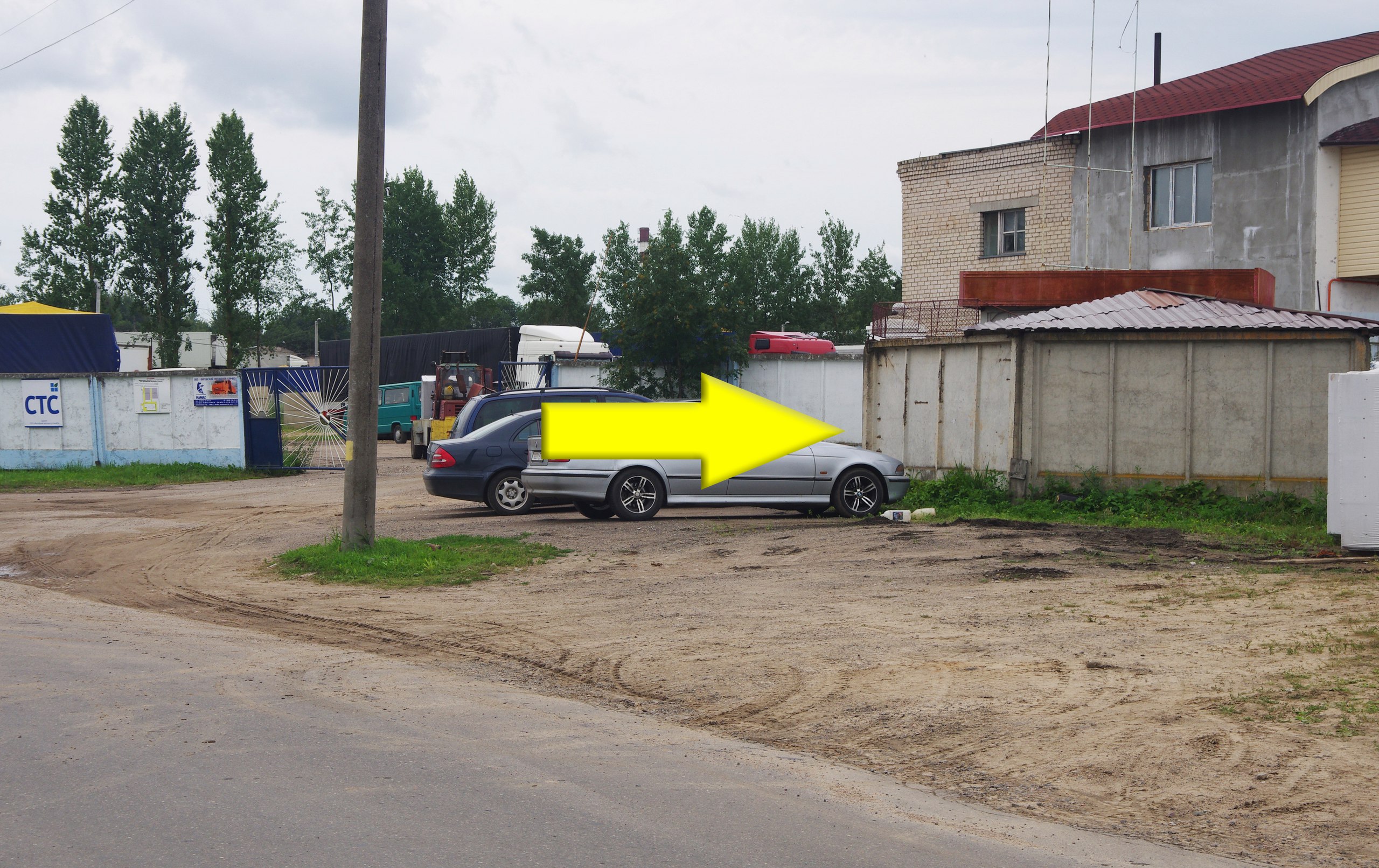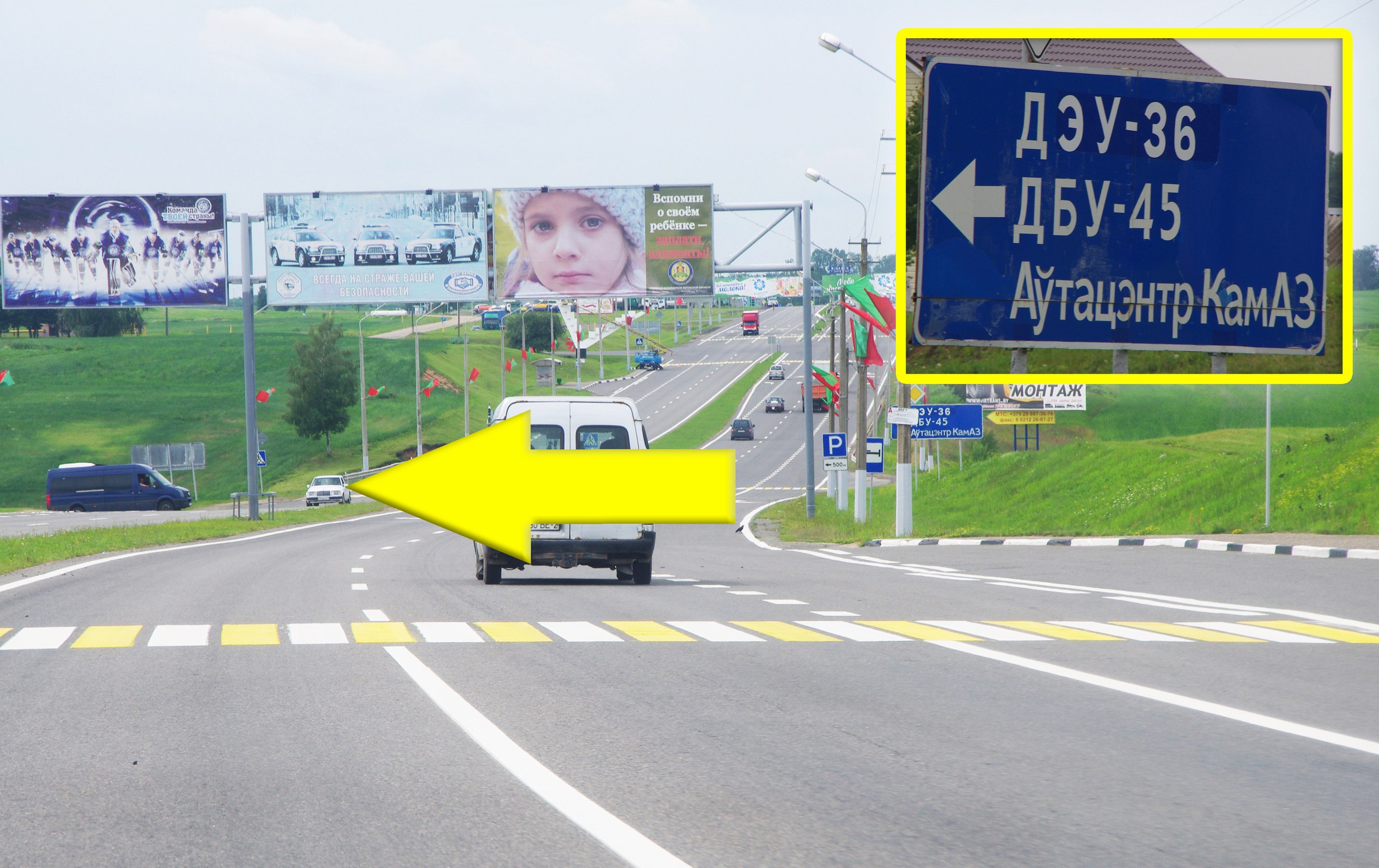 После того, как проедите по мосту через ж/д пути, следите за дорожным указателем. Когда увидите указатель «ДЭУ-36, ДБУ-45, Автоцентр КамАЗ» поворачивайте налево.