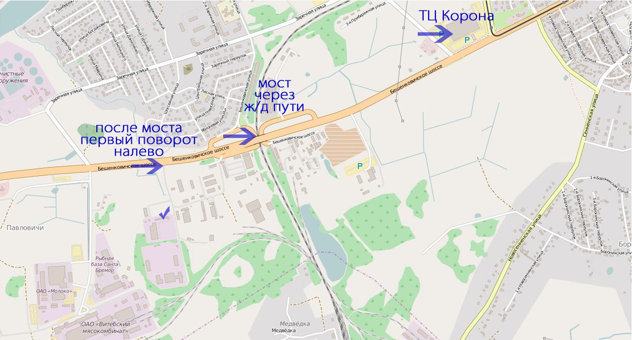 Проезжая ТЦ Корона двигайтесь в сторону Витебского мясокомбината.