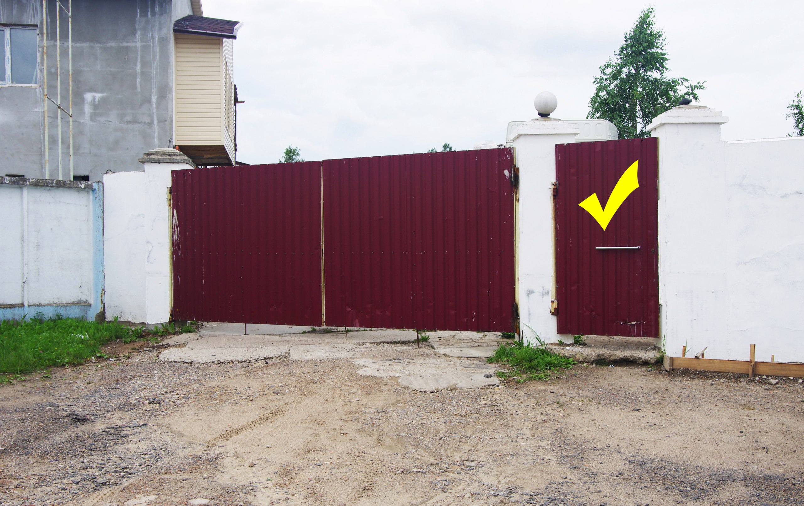 После поворота, по правой стороне дороги, проехать легковую СТО с красивым забором, сразу за ней смотреть металлические ворота из красного профиля.